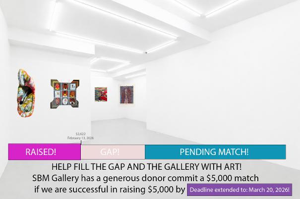 Funds are being raised for the five exhibitions planned in the first six months of this gallery pop up that will hopefully continue beyond with your help. I am excited to share that we have already raised $1,18 from individual donors! And had a donor pledge a $5,000 match if we can hit the goal! If you are able, please contribute to ensure that SBM Gallery is able to support the phenomenal group of artists involved. Tax deductible donations can be made online here: https://fundraising.fracturedatlas.org/sbm-gallery. We need to raise these funds in 30 days so give before February 20.