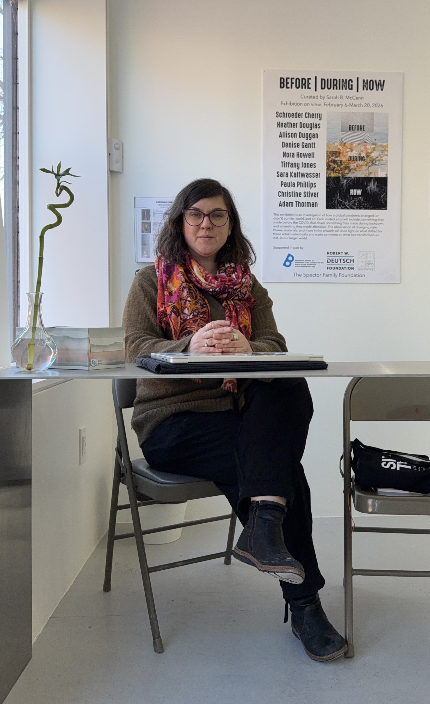 Sarah McCann is a Baltimore based artist, curator, consultant, writer, and Director of SBM Gallery. McCann’s text-based mosaics, prints, and multimedia artwork has been exhibited nationally and her most recent solo exhibition was on view at Enoch Pratt Light Street Branch in Baltimore in 2025. Since 2010 McCann has organized, curated, and installed exhibitions and related programming from conception to completion. Her curatorial methodology poses questions to artists as themes for the exhibitions and often includes youth artists and/or a community component. Her most recent curatorial endeavors include, Before | During | Now that opened in February 2026 as the inaugural exhibition at SBM Gallery. Sarah has facilitated public and collaborative projects and looks forward to continuing her work in Baltimore and beyond. McCann also works as an arts consultant. Her objective in this work is to improve visibility, expand connections, and build networks between artists, organizations, and communities.